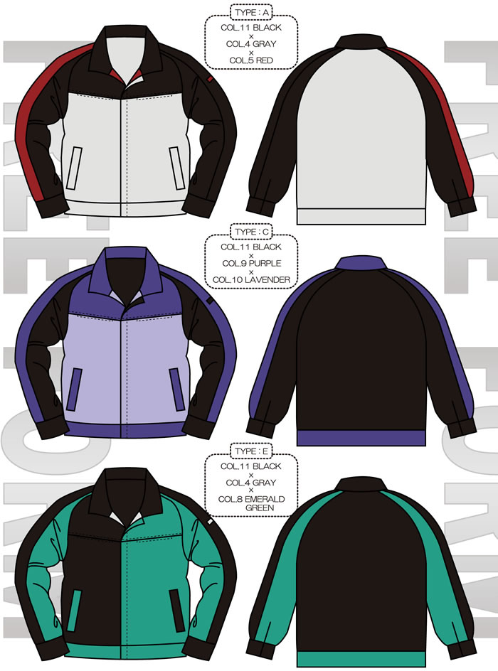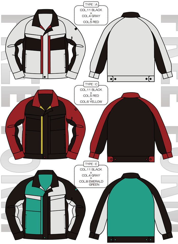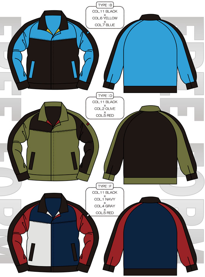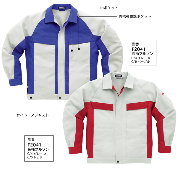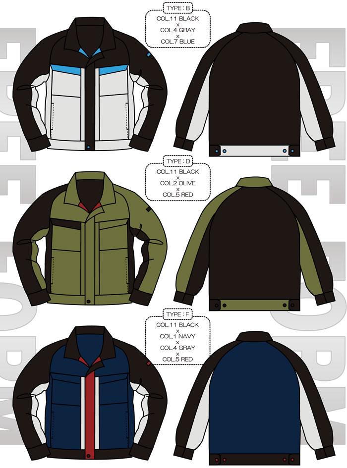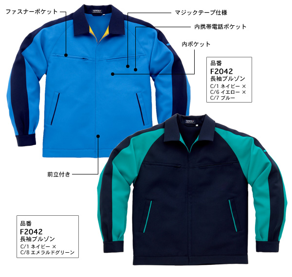 | F2042タイプ | 両胸ファスナーポケット 樹脂ファスナー・袖口マジックテープ使用 19ヶ所の配色が可能 |